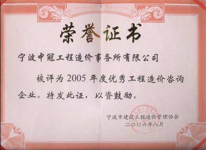“2005年度優(yōu)秀工程造價(jià)咨詢企業(yè)”榮譽(yù)證書