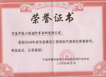 我司榮獲2008年度先進建設(shè)工程招標(biāo)代理單位榮譽稱號-中冠新聞-中冠咨詢-中冠工程管理咨詢有限公司
