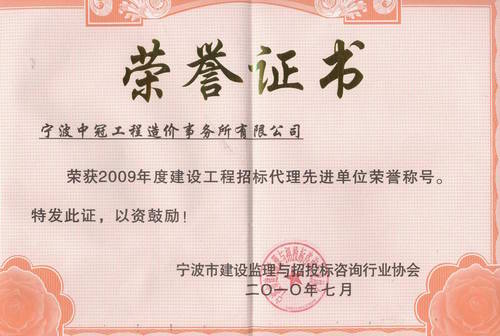 我司榮獲2009年度先進建設(shè)工程招標(biāo)代理單位榮譽稱號