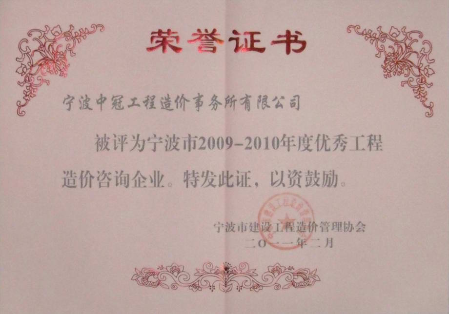 我司被評為寧波市2009-2010年度優(yōu)秀工程造價(jià)咨詢企業(yè)