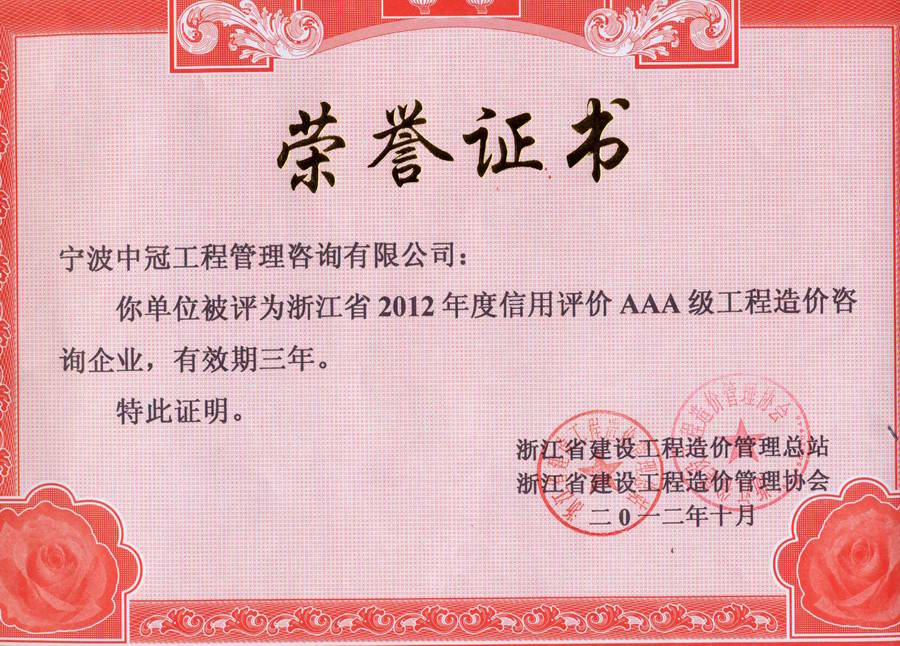 根據(jù)《關(guān)于開展浙江省2012年度工程造價(jià)咨詢企業(yè)信用評(píng)價(jià)工作的通知》精神,浙江省建設(shè)工程造價(jià)管理總站和浙江省建設(shè)工程造價(jià)管理協(xié)會(huì)組織開展了2012年度工程造價(jià)咨詢企業(yè)信用評(píng)價(jià)工作,經(jīng)信用等級(jí)評(píng)價(jià)領(lǐng)導(dǎo)小組研究審定,確定了168家AAA工程造價(jià)咨詢企業(yè),99家AA工程造價(jià)咨詢企業(yè)。中冠公司榮獲“AAA工程造價(jià)咨詢企業(yè)”,公司副總經(jīng)理陳勇到會(huì)參加,并在會(huì)上接受了頒發(fā)的證書。 二0一二年十一月十五日