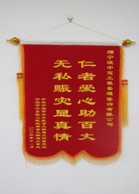 11月20日下午,江東區(qū)百丈街道主任曹敬之一行來我公司,送來一面寫有 “仁者愛心助百丈、無私賑災(zāi)顯真情”的錦旗,感謝我公司在今年抗臺救災(zāi)期間,向百丈街道捐款。 今年10月,受強(qiáng)臺風(fēng)“菲特”影響,江東區(qū)百丈街道多處社區(qū)因遭遇暴雨影響,導(dǎo)致社區(qū)內(nèi)涉水嚴(yán)重。我公司在接到街道援助信息后迅速響應(yīng),捐款貳萬元人民幣,為災(zāi)區(qū)送溫暖。