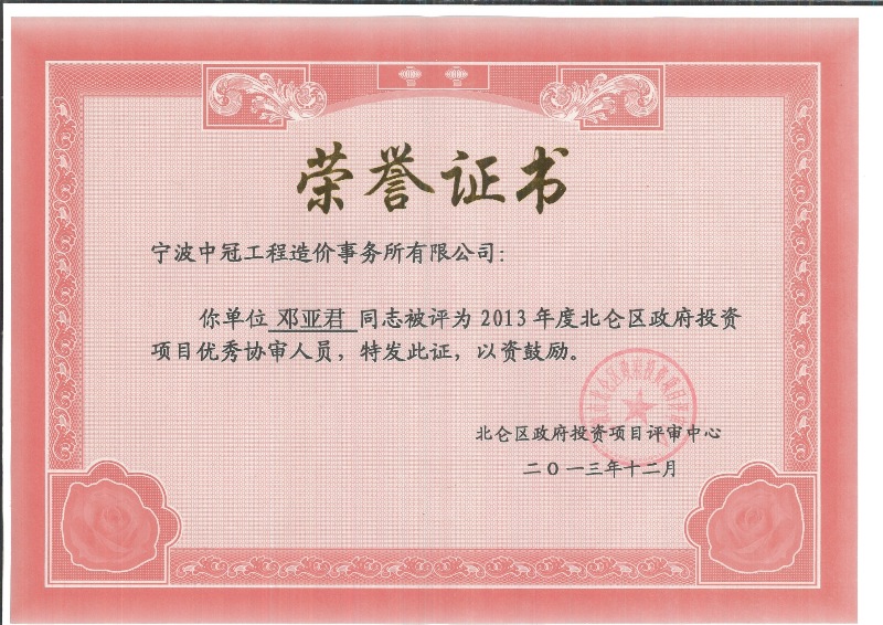 經(jīng)北侖區(qū)評審中心對2013年度協(xié)審項目考核結(jié)果,我公司鄧亞君同志續(xù)2011年度,再次被評審中心評為為優(yōu)秀協(xié)審人員。