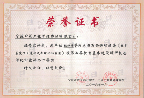 根據(jù)寧波市教育局計(jì)財(cái)處、寧波市教育基建學(xué)會,近期發(fā)布的《關(guān)于公布第二屆教育基本建設(shè)調(diào)研報(bào)告評比結(jié)果的通知》,我公司張曉坤撰寫的調(diào)研報(bào)告《教育基建項(xiàng)目建設(shè)成本理論和應(yīng)用》在第二屆教育基本建設(shè)調(diào)研報(bào)告評比中榮獲二等獎