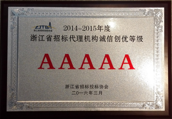 根據(jù)浙江省招標(biāo)投標(biāo)協(xié)會近期發(fā)布的《關(guān)于表彰2014-2015年度浙江省招標(biāo)代理機(jī)構(gòu)誠信創(chuàng)優(yōu)活動優(yōu)勝單位的決定》,我公司被授予“2014-2015年度浙江省招標(biāo)代理機(jī)構(gòu)誠信創(chuàng)優(yōu)等級AAAAA單位”榮譽(yù)稱號。