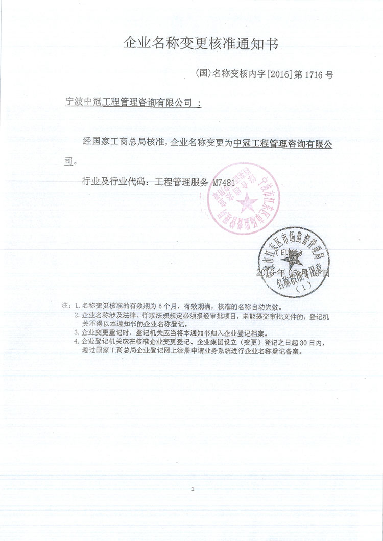 為配合公司中長(zhǎng)期發(fā)展規(guī)劃,經(jīng)公司研究決定,現(xiàn)將公司名稱更名為“中冠工程管理咨詢有限公司”,注冊(cè)資金增資至5000萬(wàn);上述內(nèi)容已獲工商批準(zhǔn)通過(guò)。 自2016年6月7日起,公司統(tǒng)一使用最新公司名稱。 (后附名稱變更核準(zhǔn)通知書)
