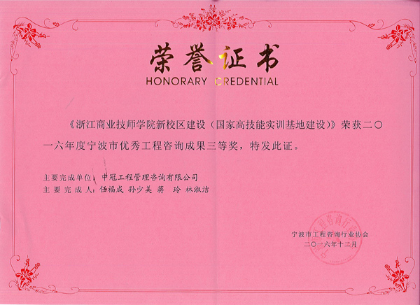 根據(jù)寧波市工程咨詢行業(yè)協(xié)會,近期發(fā)布的《關于公布2016年度寧波市優(yōu)秀工程咨詢成果獎獲獎項目名單的通知》(甬咨[2016]4號),經(jīng)評審由我公司任福成、孫少美、蔣玲、林淑潔等人員編制的《浙江商業(yè)技師學院新校區(qū)建設(國家高技能實訓基地建設)》項目可行性研究報告榮獲2016年度寧波市優(yōu)秀工程咨詢成果獎三等獎。 特此報喜