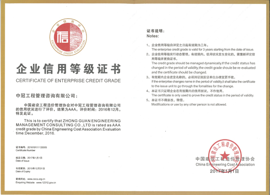 我公司在由中國(guó)建設(shè)工程造價(jià)管理協(xié)會(huì)組織的2016年度全國(guó)工程造價(jià)咨詢企業(yè)信用評(píng)價(jià)中,被評(píng)定為AAA級(jí)(最高等級(jí)),有效期三年。公司獲此殊榮,這既是對(duì)我們?cè)诠こ淘靸r(jià)咨詢中良好信譽(yù)的認(rèn)可,也是綜合實(shí)力的體現(xiàn)。今后我們也將更加珍惜“中冠”的良好口碑,用實(shí)際行動(dòng)堅(jiān)決維護(hù)社會(huì)誠(chéng)信,為打造健康、和諧的市場(chǎng)環(huán)境而不懈努力。