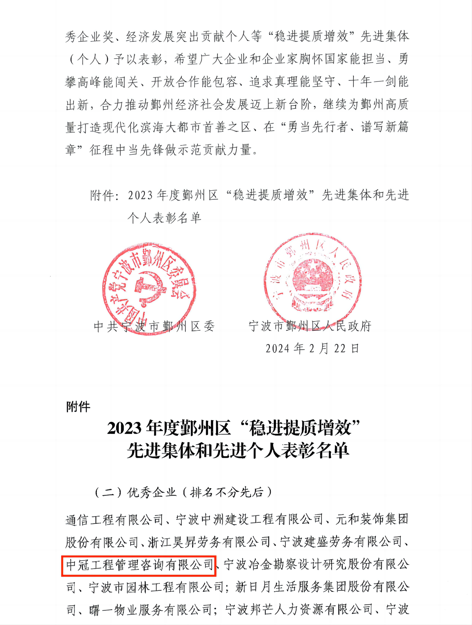 中冠喜報 | 我司獲評2023年度鄞州區(qū)“穩(wěn)進提質(zhì)增效”先進集體-優(yōu)秀企業(yè)-中冠新聞-中冠咨詢-中冠工程管理咨詢有限公司